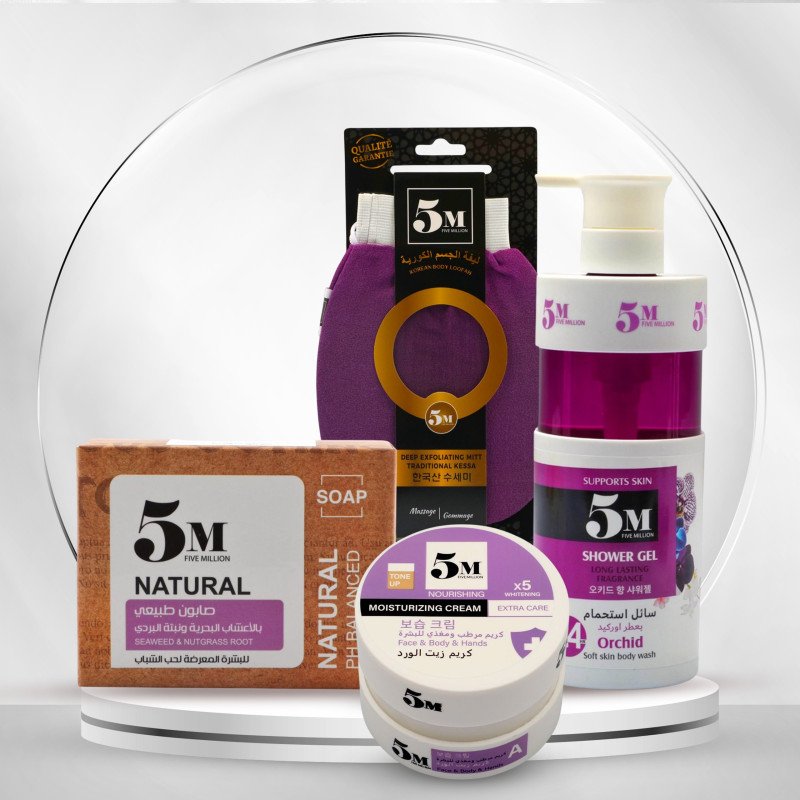 باقة 5M لتفتيح وترطيب الجسم – تنظيف عميق، تقشير، نعومة وإشراقة من أول استخدام