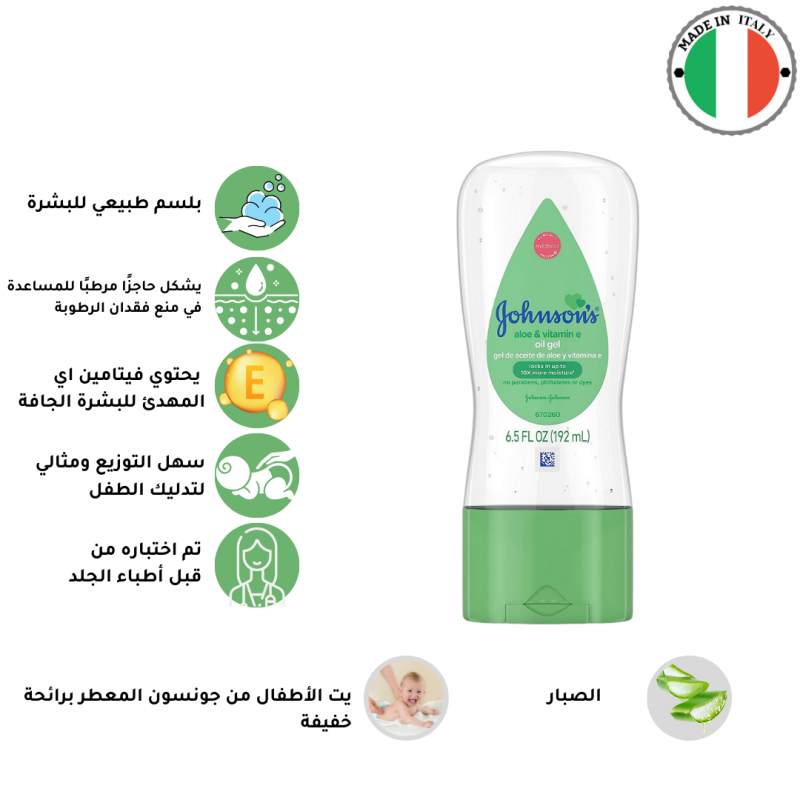 زيت جونسون بيبي معزز بصبار الالوفيرا الطبيعي، الذي يُعرف بخصائصه المهدئة للبشرة الجافة، فضلاً عن فيتامين E، الملطف المعروف للبشرة.