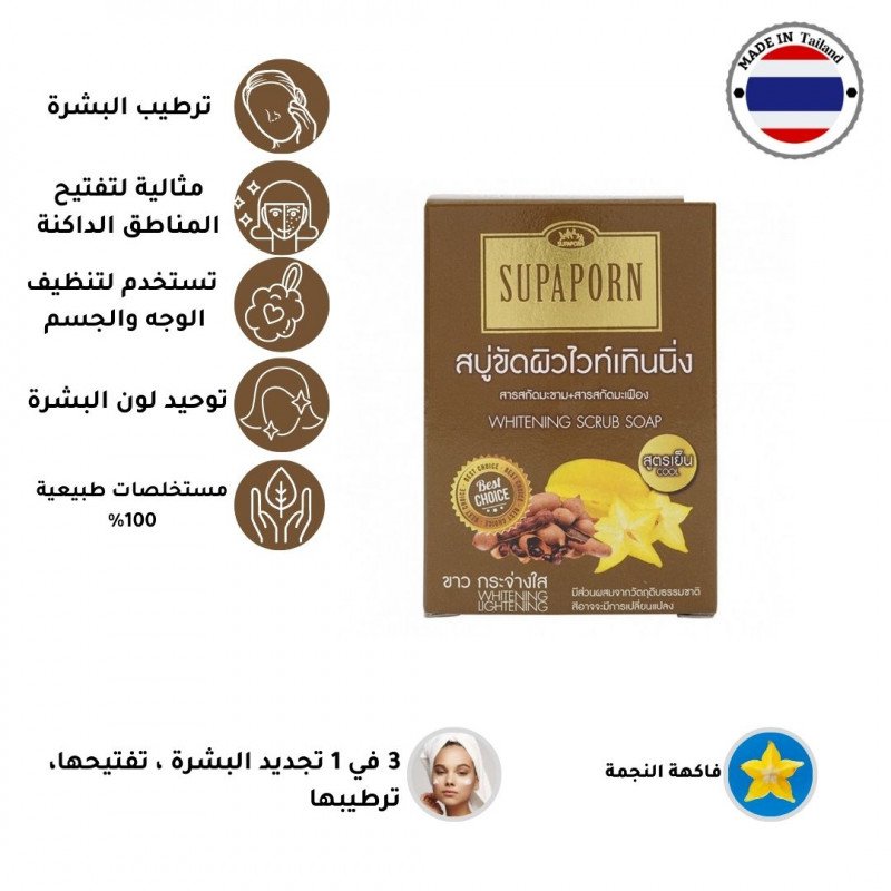 صابونة مستخلص التمر الهندي وفاكهة النجمة لتنظيف الوجه والجسم 3 في 1 تجديد البشرة ، تفتيحها، ترطيبها يساعد حمض ألفا هيدروكسي الطبيعي البشرة على زيادة إشراقها ونعومتها ومظهرها الصحي بالإضافة إلى مستخلص فاكهة النجمة لاستعادة رطوبة البشرة بلطف تمتع ببشرة أكثر اشراقاً ونعومة كل يوم باستخدام صابون مقشر التبييض من سوبابورنطريقة الاستخدام
