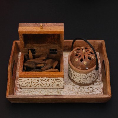 طقم مبخره وبخور ، حصريا لدي متجرنا افضل طقم بخور مصنوع من خامات مميزه من خشب شجر المانجو الذي يزيده جمالا واناقه ومصنوع باحترافيه باللون الابيض المميز والذي يمنحك استخدام راقي يناسبك في الضيافة والتعطير. مواصفات طقم مبخره وبخور ابيض : نوع المنتج : طقم بخور بنقوش عربية. العدد : 3 قطع. التصميم : بنقوش عربية. الشكل : الأحرف العربية. الاستخدام : تستخدم في التبخير. الفئة المستهدفة : الجميع. القسم : اطقم الضيافه. الألوان المتاحة : متوفر باللون الأبيض. المحتويات : طقم مكون من مبخره و صينية تقديم و صندوق لحفظ العود و البخور. مصنوع من : خشب شجر المانجو و مزخرف بالنحاس. مميزات طقم بخور ابيض : طقم مبخره وبخور اختيارك الأمثل طقم فاخر للتبخير. يناسب الاستخدام المنزلي أو المجالس والقاعات وغيرها من الأماكن. مميز بشكل ديكوري فاخر عالي الجودة حيث يوفر لك جميع احتياجاتك لعمل بخور مميز يتم توزيعه في جميع الاماكن. طقم بخور ابيض مصنوعة بشكل زخرفي رائع ومميز. تصميمها انيق وجميل ومتناسق مع كامل القطع. متوفر معه صندوق خاص بحفظ اعواد البخور للحفاظ عليها بشكل عالي الجوده.